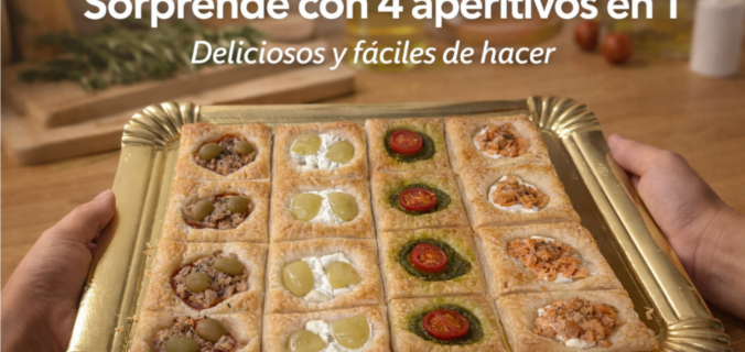 Con una sola masa de hojaldre preparamos cuatro aperitivos distintos, combinando ingredientes sencillos y sabores que funcionan siempre. El resultado es una bandeja variada, colorida y muy apetecible, perfecta para compartir.